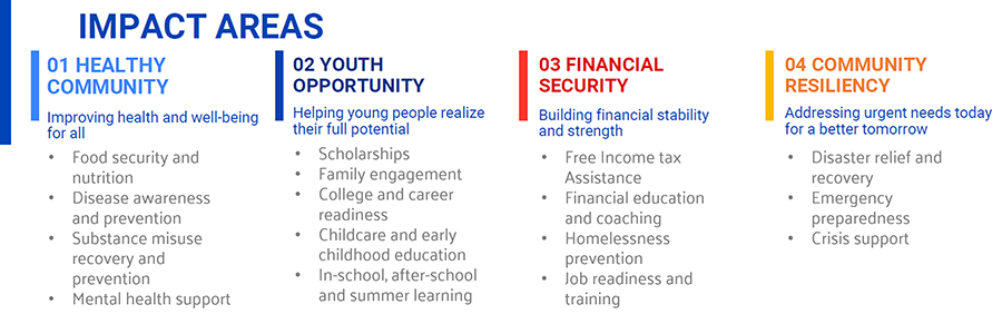 Our internal United Way Programs fall into these areas below. Agencies are identifying these impact areas in 2024 applications for 2025 funding.